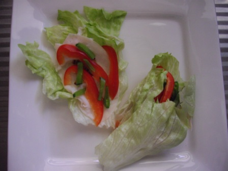 Gently take off the outer leaves of an iceberg salad and fill each leaf with slices of deli chicken, red capsicum and snow peas. Gently fold each leaf together and place them tightly in a container so they won't fall apart. You can also secure them with a toothpick but don't forget to take them out before you eat your rolls!